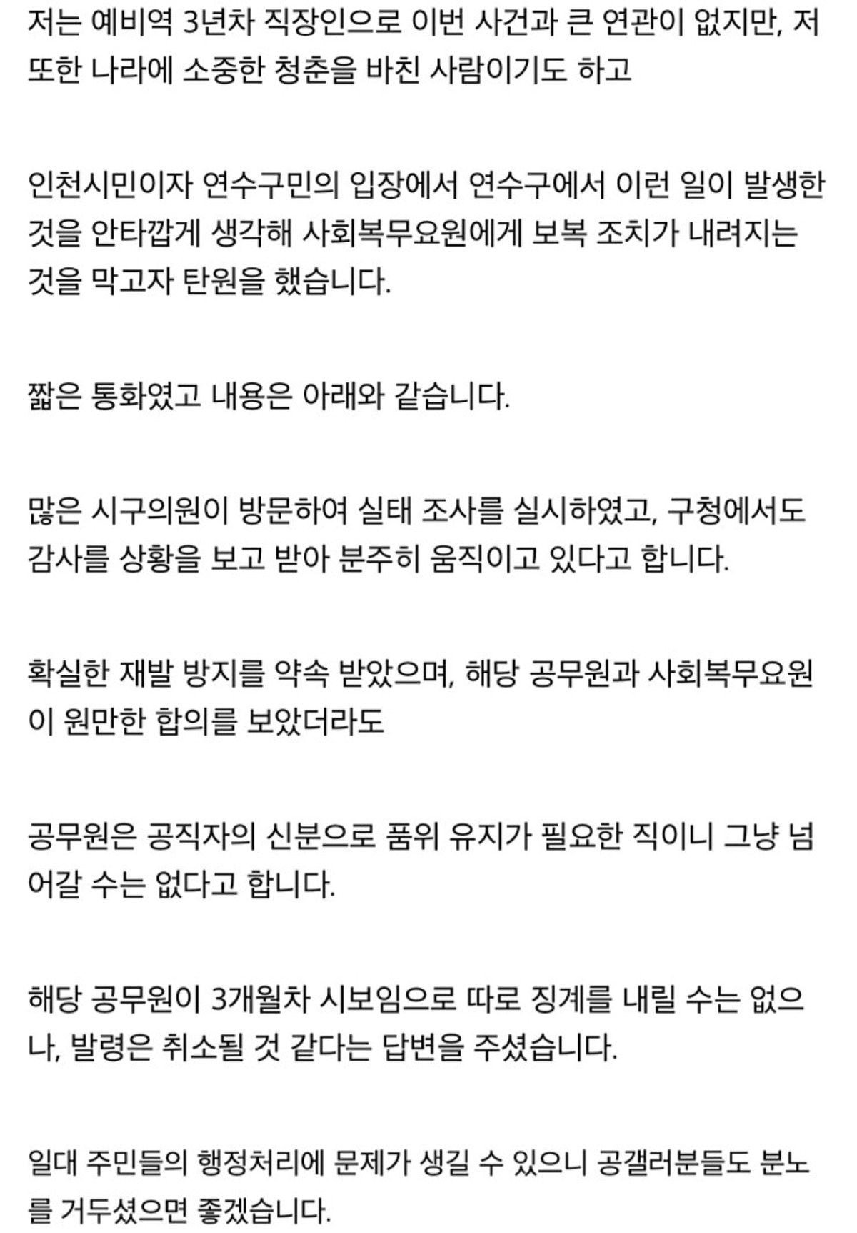 사건개요- 0. 해당 공익은 군대에서 허리를 다쳐서 공익으로 재발령나 주민센터로 발령받음 1. 공익을 우습게 보던 여공무원이 평소 무시함 2. 가혹한 업무를 떠넘겼지만, 공익은 휴가나온 군인친구까지 불러 어떻게든 함 3. 마스크작업 3주동안 일했는데 갑자기 다 꺼내서 봉투에 넣으라고 업무초기화되어 같은일 두번함 4. '혼자서 3.5만장 하는것이라 오류가 생길수밖에 없다 이 업무 담당자가 아니다' 한마디 함 5. 극노한 공무원이 공익담당자에게 뒷담하면서 혼내달라고 함. 6. 공익담당자가 공익불러 주의 주는데, 바로 옆방에서 그 여자가 다른 공무원들에게 공익을 험담을 크게 함 7. 공익담당자에게 이렇게 욕하고 있는것을 참아야하냐니까, 자기가 주의준다고 함. 8. 점심시간 지나고 와서 "일부러 큰소리로 욕한거라고" "군대보다 편한거 아니냐고 참고하라고" "듣고 느끼라고 욕했다" 9. 3.5만장은 너무 많은것 아니냐니까 "왜 도와달라고 안했어?", 원래 도와달라고 했을때 "열심히 하세요~"라고 했었음 10. 그뒤 정치질로 괴롭힘 11. 그것도 모자른지 네이트판에 피해자인척 공익이 일안하고, 책임전가한다는둥 정치질하며 마녀사냥함. 12. 빡친 공갤러들 신문고 인권위에 민원 난사 시작 13. 여공무원이 글 폭파하고 자기가 잘못했다며 사죄문 올림. 14. 여공무원은 시보라고함;; 시보 임용후보자가 정식 공무원으로 임용되기 이전에, 그 적격성을 판정받기 위해 일정 기간 동안 거치게 되는 시험 기간 중의 공무원 신분을 말한다. 임용권자는 추천된 임용후보자 가운데 적격자를 선발해 일정한 기간 동안 시보 공무원으로 임명하는데, 시보 공무원은 시보 기간이 끝난 뒤 정식 공무원으로 임명된다. 시보는 주로 신규채용 공무원을 대상으로 하나 경우에 따라서는 승진, 전보, 전직 등 내부임용의 경우에도 적용할 수 있다. 0