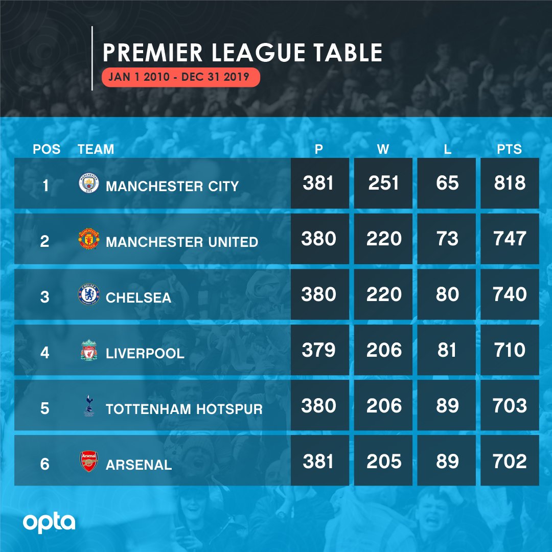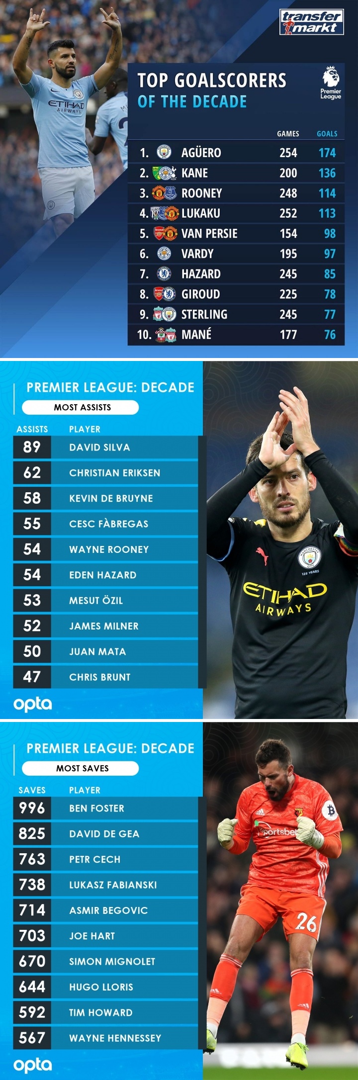 맨시티는 우승도 4번이나 했고... 재미있는건 우승 3회의 첼시가 우승 2회의 맨유보다 승점이 낮다는 점? 참고로 10년 단위로 끊었을 때 맨체스터 시티보다 더 많은 승리를 거둔 팀은 2000년대의 맨체스터 유나이티드 밖에 없다고 합니다. 2000-2009년 퍼거슨의 맨체스터 유나이티드는 255승을 기록. 골과 어시스트 기록은 맨체스터 시티에서 10년간 꾸준하게 좋은 활약을 보여준 아구에로와 다비드 실바가 가져갔네요. 0