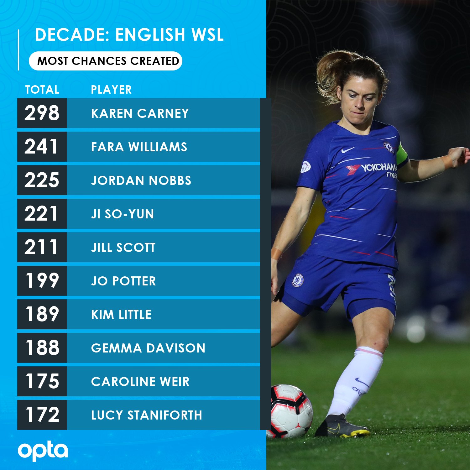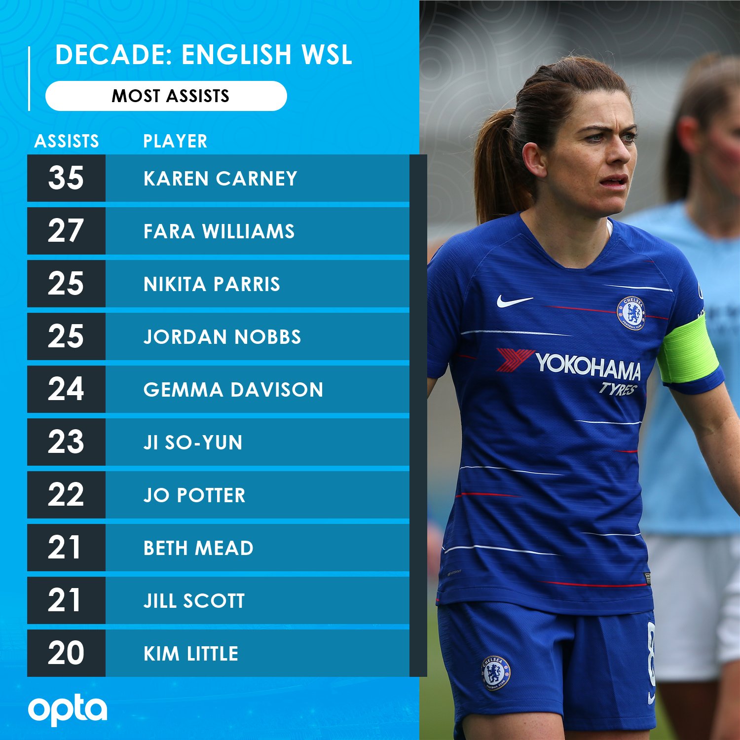 지소연이 첼시 위민 팀으로 이적한게 2014년 1월이니 벌써 시간이 많이 흘렀네요. 해당 자료는 잉글랜드 WSL 리그에서 2010년대 10년간 기록한 어시스트와 찬스 메이킹 순위입니다. 어시스트는 전체 6위, 찬스 메이킹은 4위에 위치했네요. 물론 두 자료에서 모두 1위를 차지한 저 Karen Carney 선수가 같은 팀에서 더 훌륭한 퍼포먼스를 보여주고 있지만 지소연의 활약도 팀 내를 넘어서 리그에서 손꼽히는 수준임을 보여주는 듯 합니다. 실제로 지소연 선수는 PFA 올해의 팀에도 여러번 들어갔더군요. 2