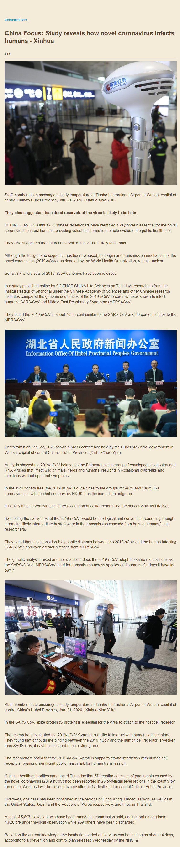 댓글을 봐도 중국에 실제 거주하시는 분이 올린 글같습니다 (http://www.slrclub.com/bbs/vx2.php?id=free&no=37628583) ------------------------ 23일 10시부터 우한의 모든 공공교통은 당분간 운행중지입니다. 시내버스 / 장거리운행버스 / 지하철 / 배 모두 포함됩니다. 공항 폐쇄는 아직 결정되지 않았지만 우한에서 타지역으로 가는 항공편의 공항검색이 높은 등급으로 강화된 상태입니다. 주요 고속도로 톨게이트 검색도 강화되어 우한지역 사람들이 타지역으로 이동하는 것을 최대한 막고 있습니다. 그리고 공공시설을 비롯 사람이 많은 쇼핑몰 / 백화점은 마스크를 의무적으로 착용하도록 하고 있습니다. 마스크 미착용시 출입 자체가 제한됩니다. 아울러 현재 바이러스의 발원지로 가장 의심되고 있는 여러 동물의 식재료 판매 및 유통이 전면 금지된 상태입니다. 중국 정부는 대국민 공지를 통해서 마스크를 꼭 착용할 것을 당부하고 있고. 외출후 손씻기를 잊지 말라고 알리고 있습니다. <그 밖의 괴담에 대하여> 1. 몰래 비행기를 타고 한국으로 들어와 치료를 받겠다? 일단 공항검색에서 걸린다고 보시면 됩니다. 현재 공항폐쇄 직전의 상황에서 공항 검색이 어느정도 수준인지는 짐작이 가실겁니다. 해열제를 먹고 일시적으로 체온을 낮춰서 타면 된다는 말들도 있었지만. 어제 1명이 공항에서 실제로 같은 방법으로 시도하다가 적발된 사례가 있었습니다. 공안이... 그렇게 허술하지 않습니다. 가능성이 아주 낮은 방법이라고 보시면 됩니다. (SBS에서 나온 인터뷰 기사를 쓴 기레기는... 영화를 너무 많이 봤나 봅니다) 2. 마스크 구하기는 아직 쉬운 편입니다. 일부 품절사태가 있기는 했지만 이때를 틈타 가격을 올리는 판매자를 중국 정부가 단속하고 있고 중국인들도 자발적으로 신고를 하고 있는 상황이라 전에 비해 가격이 높아진 것은 사실이지만 품귀현상까지는 아닙니다. 그리고 지역보건소 같은 곳에서는 무료로 나눠주기도 하기 때문에 현재까지는 별 문제가 없습니다. 3. 중국 정부발표 감염자 숫자와 사망자 숫자를 신뢰할 수 없다. 현재 사망자는 17명인 것으로 발표되었습니다. 그 중 15명이 70이상 노인층이고 50대가 나머지 2명이라고 합니다. 중국 사람들 조차 발표숫자 X20 이 대략적인 숫자라고 짐작하고 있는 상황입니다. 그래서 다들 마스크 하고 되도록 외출을 삼가하고 있습니다. 4. 언론통제가 심하다? 가장 먼저 사람간 전염 소식이 나온 곳이 웨이신(중국의 카톡) 채팅방 캡처가 나오면서 부터입니다. 현재 중국 전역에서 많은 소식이 웨이신과 웨이보를 통해 나오고 있는 상황입니다. 병원에서 사진찍어 올리는 사람도 많고 교통상황을 사진찍어 올리는 사람도 있고. 돈과 목숨 관련해서는... 중국 사람들도 우리와 같은 행동을 합니다. 통제를 한다고 해서 그게 통제되는 상황이 아닙니다. 현재. 5. 최초 바이러스가 박쥐로 부터 나왔다? 한 의사가 "그럴 것으로 추측하고 있다" 라고 말한 것이 한국 언론을 거쳐서 "박쥐로 부터 나왔다" 가 되었고. 그것을 본 일부 네티즌들은 "박쥐를 왜 쳐먹고 지랄이냐"로 발전되고 그것을 본 또 일부 네티즌들은 "뭐든 쳐먹는 중국놈들"로 발전하고 거짓뉴스가 퍼지는 패턴은 늘 비슷합니다. <중국에서는> 지금 바이러스가 퍼지는 속도와 사망자 숫자를 보면 사스와 비슷할 것이라는 의견이 지배적입니다. 중국 정부가 한 지역의 공공교통을 그것도 춘절을 맞은 시점에 완전히 통제하는 것은 이례적인 일입니다. 따라서 되도록이 아닌 그냥 우한은 안가는게 좋습니다. 여행/업무 등의 모든 일정을 취소하시길 (개인적으로) 강력히 추천드리고 기타 다른 중국 지역으로의 여행시에는 마스크를 항상 착용하시고 손 씻으세요. 식당에 가시게 되면 되도록 개인수저/젓가락을 가지고 가시구요. <한국에서는> 우선 공항 근처로는 가지 마세요. 현재로서는 공기전염이 아닌 타액을 통한 전염성이 가장 높다고 하니 마스크 착용과 손씻기... 아니면 장갑을 착용하고 공공교통/시설을 이용하시는 게 좋을 것 같습니다. 하지만. 아직 한국은 비교적 안전한 상태이니 만큼. 너무 호들갑 떨지 않으셔도 될 것 같습니다. 많은 분들이 중국의 초기대응에 대해 많이들 욕하고 계십니다. 중국 내에서도 같은 이유로 우한지역사람들을 욕하고 있습니다. 욕받이를 찾는 것보다 바이러스를 잡는 치료제 개발이 시급한 시점입니다. 예방하고 주의해서 걸리지 않도록 합시다. 1