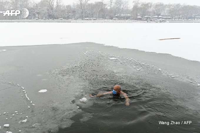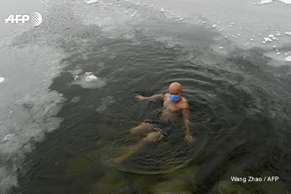 *사진은 어제 화제가 된 베이징 얼어붙은 호수에서 "마스크는 쓰고" 수영하는 아저씨. 오늘도 마스크 쓰고, 수영을 했다고 합니다?! 2