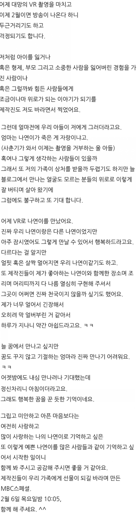 어머니께서 블로그를 통해 후기를 적으시곤했는데 방송 이후 당사자가 아닌 제 3자들의 각종 오지랖(이제 좀 보내줘라, 살사람은 살아야지 잊어라 등등)과 혐오성 악플등으로 블로그 닫으심... 아...진짜 헬조선식 엔딩도 아니고.. 너무 짜증나고 갑갑하네요. 1