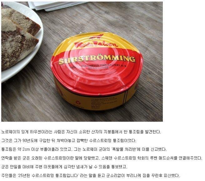수르스트뢰밍 [Surströmming] : ‘신 청어’라는 이름도, 썩은 달걀과 하수도 냄새 사이의 중간 어디쯤을 연상시키는 끈질기게 없어지지 않는 코를 찌르는 냄새.. [네이버 지식백과]