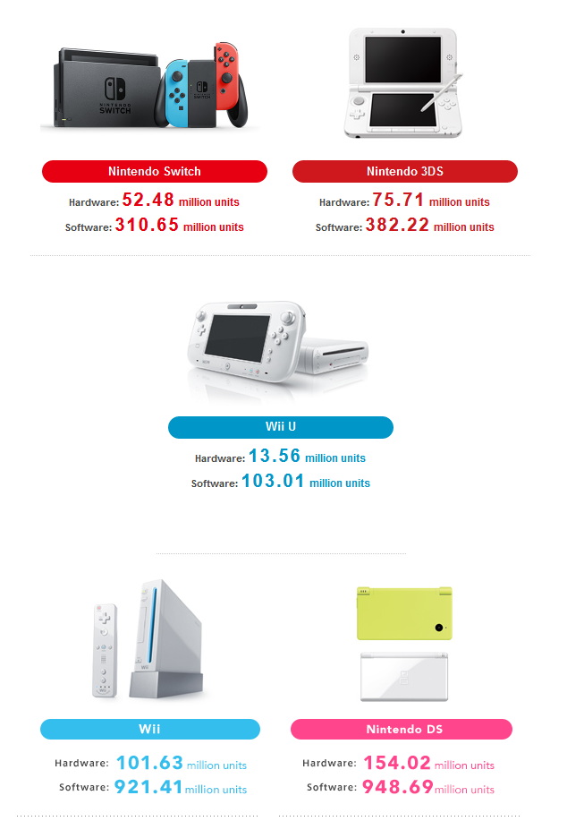 2019년 말 기준으로 5248만대. DS나 Wii에 비해 모자라는 듯 보이지만 아직 출시한 지 만 3년도 안 됬다는 걸 감안해보면 정말 무시무시한 판매량이 아닐 수 없.... 참고로 PS4랑 동기간 대비 비슷하게 팔고 있으니 (PS4는 1억대 조금 넘게 팔았고 이제 거의 끝물입니다.) 아마 최종 판매량도 1억대 가량이 될 것으로 보입니다. 36만원짜리 휴대기를 참 많이도 팔았다... 0