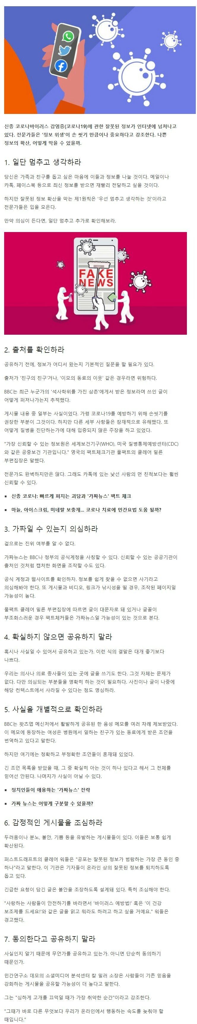 https://www.bbc.com/korean/news-52073919 ----------------------------------- 출처랑 진짜인지 여부는 모르겠고, 보자마자 7가지 모두 좋은 내용처럼보여서 동의하는 의미로 생각않고 바로 퍼왔습니다. 무시무시한 가짜 뉴스가 퍼지는 두려운 상황을 막기위해 이 기사대로 꼭 해보세요! 혹시나 사실일 수도 있으니까요. 2