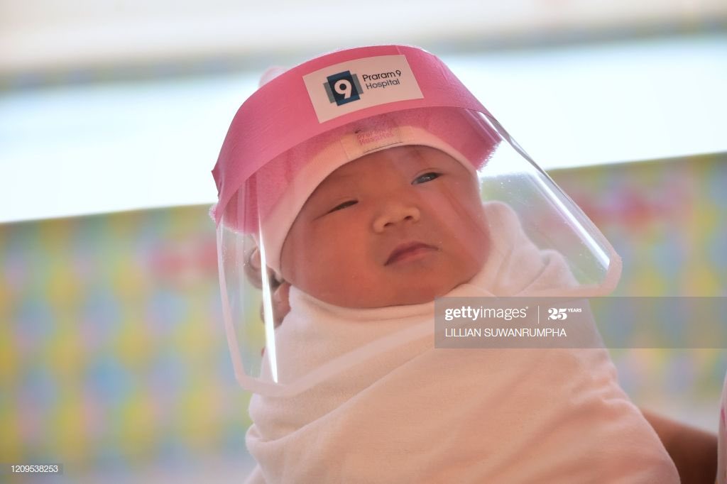 방콕 병원에서는 신생아에게 페이스 쉴드를 씌운다고 합니다.