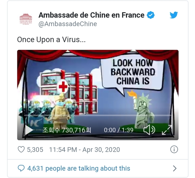 https://www.youtube.com/watch?v=Q5BZ09iNdvo https://www.newsweek.com/chinese-embassy-france-mocks-us-coronavirus-response-once-upon-virus-animated-video-1501321 중국이 미국과 트럼프의 COVID-19에 대한 대응을 조롱하고 나섰습니다. 이건 도대페 무슨 자신감과 파렴치함일까요? 다른 나라들은 놀릴 수 있어도 중국은 그럴 자격이 되지 않는 것 같은데요. 0