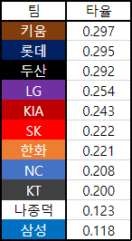 | Subject | 오늘 2회말 종료 시점 팀타율 순위 |