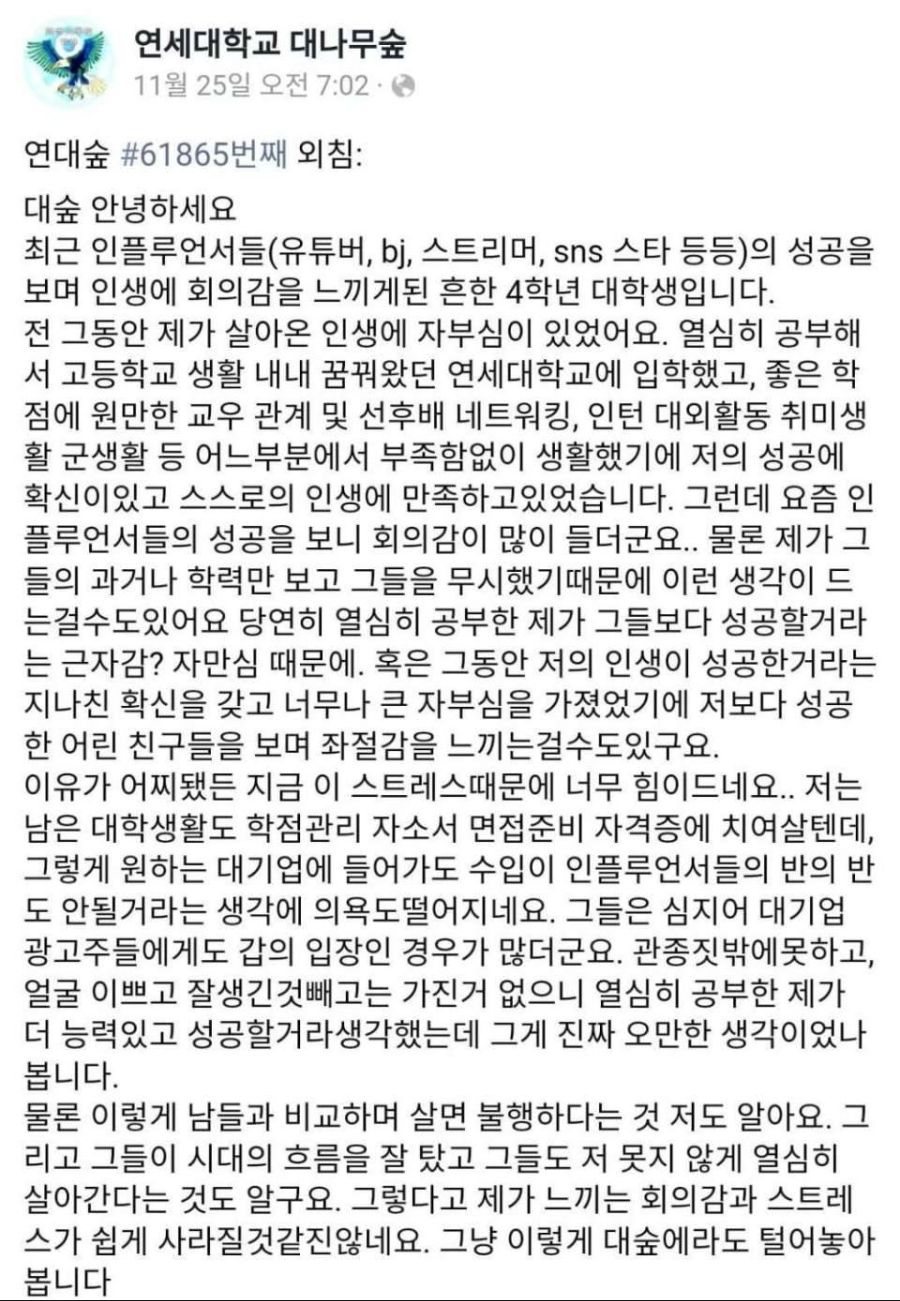 Subject   성공한 유튜버들 보고 현타온 연대생