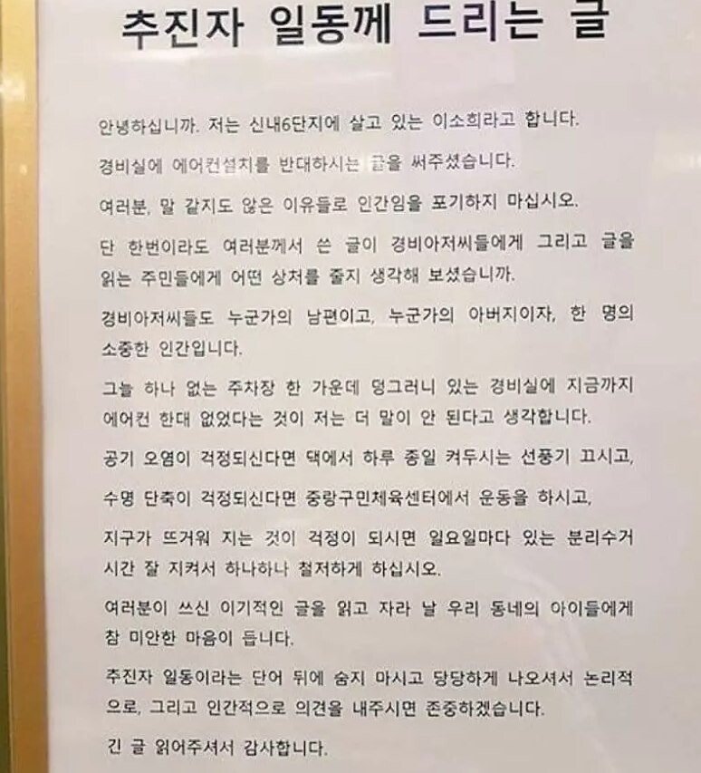 | Subject | 경비실 에어컨 설치 반대하는 주민들에게 광역도발 시전하는 학생 |