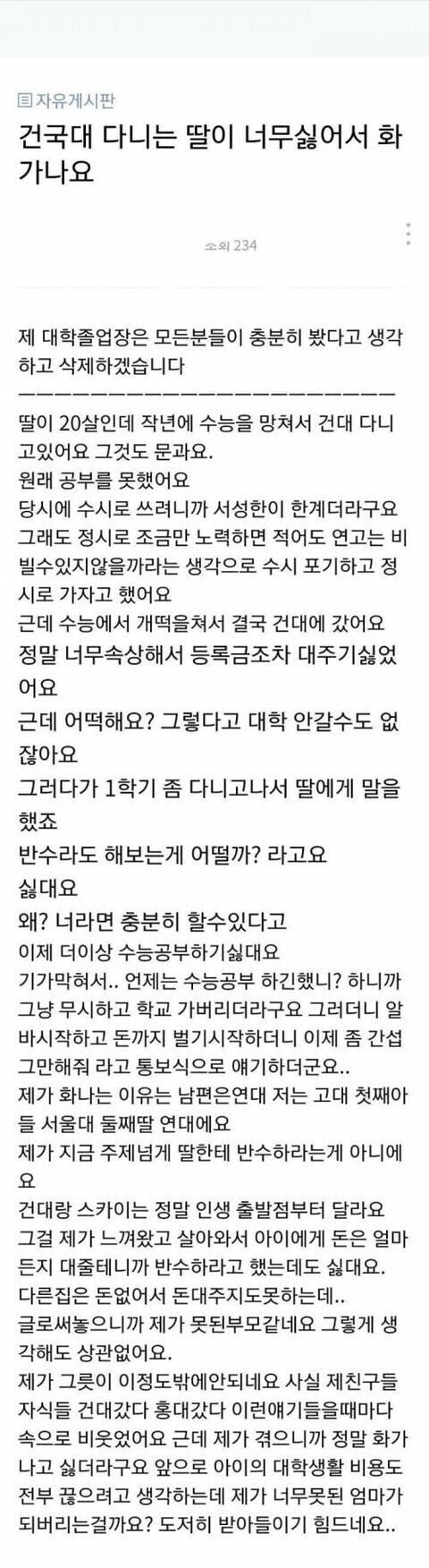 Subject   건국대 다니는 딸이 너무 싫어서 화가 나요