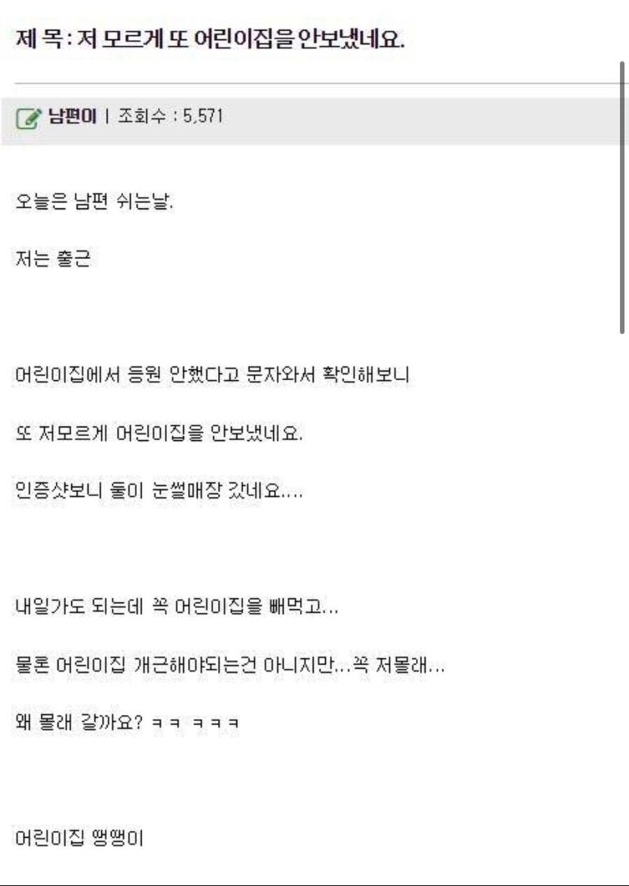 Subject   애 아빠가 저 모르게 또 어린이집을 안보냈네요