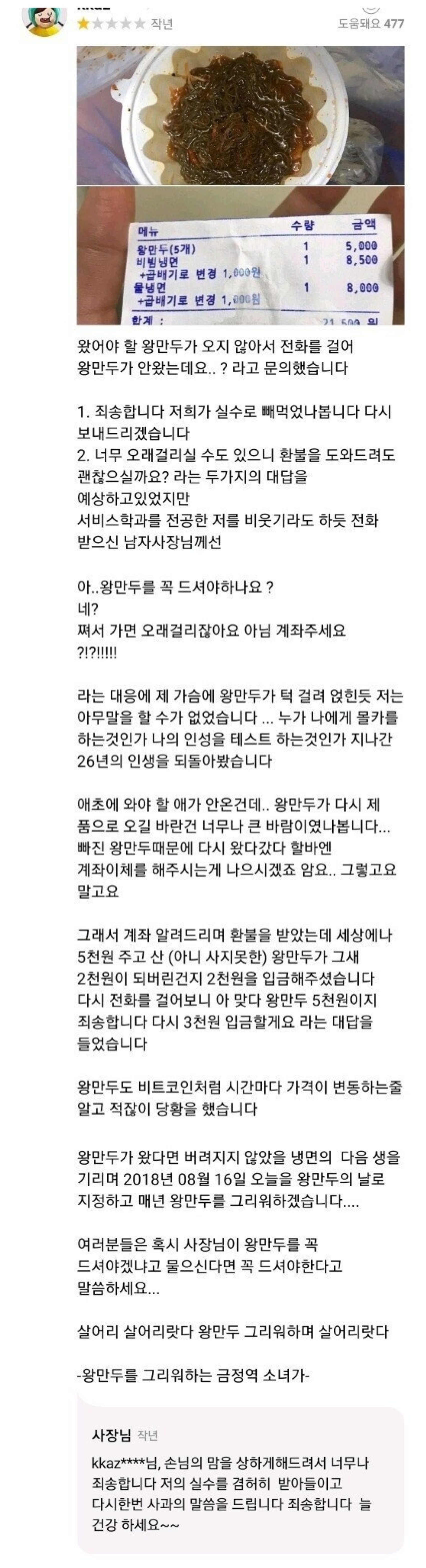 | Subject | 왕만두가 오지 않아서 속상하네요.. |