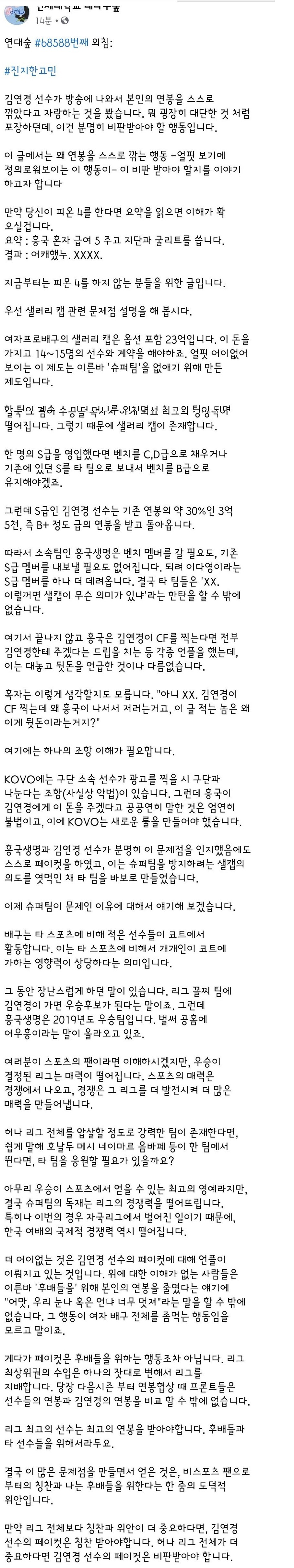 | Subject | 연대숲에 올라온 김연경 페이컷에 대한 비판 글.jpg |
