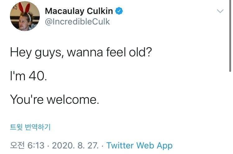 얘들아 니들 나이 먹은 느낌 알려 줄까? 내가 40 살 이야 고맙다고 안해도 돼 워낙 어릴때 이미지만 남아있어서 나이체감이 안 됐는데 컬킨이 나보다 형이구나 ㅋㅋㅋ 2