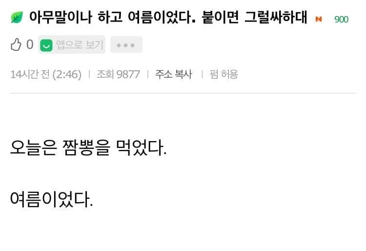 | Subject | 아무말이나 하고 뒤에 여름이었다. 붙이면 그럴싸하대 |