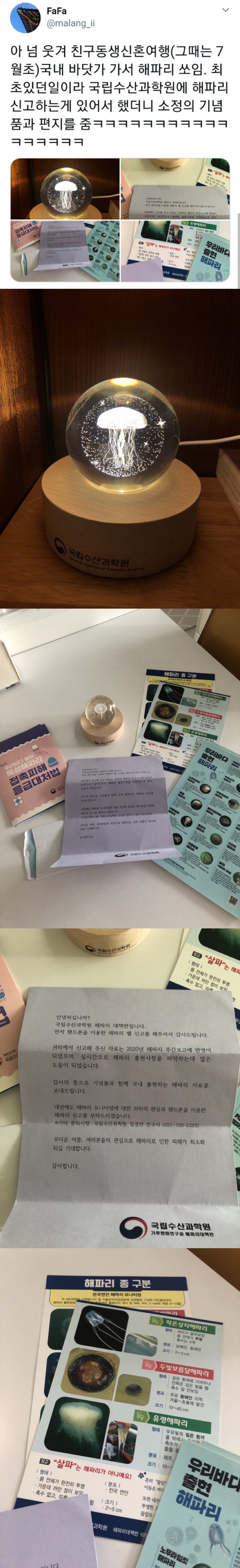 | Subject | 바다에서 해파리에 쏘인 사람이 신고했더니 받은것 |
