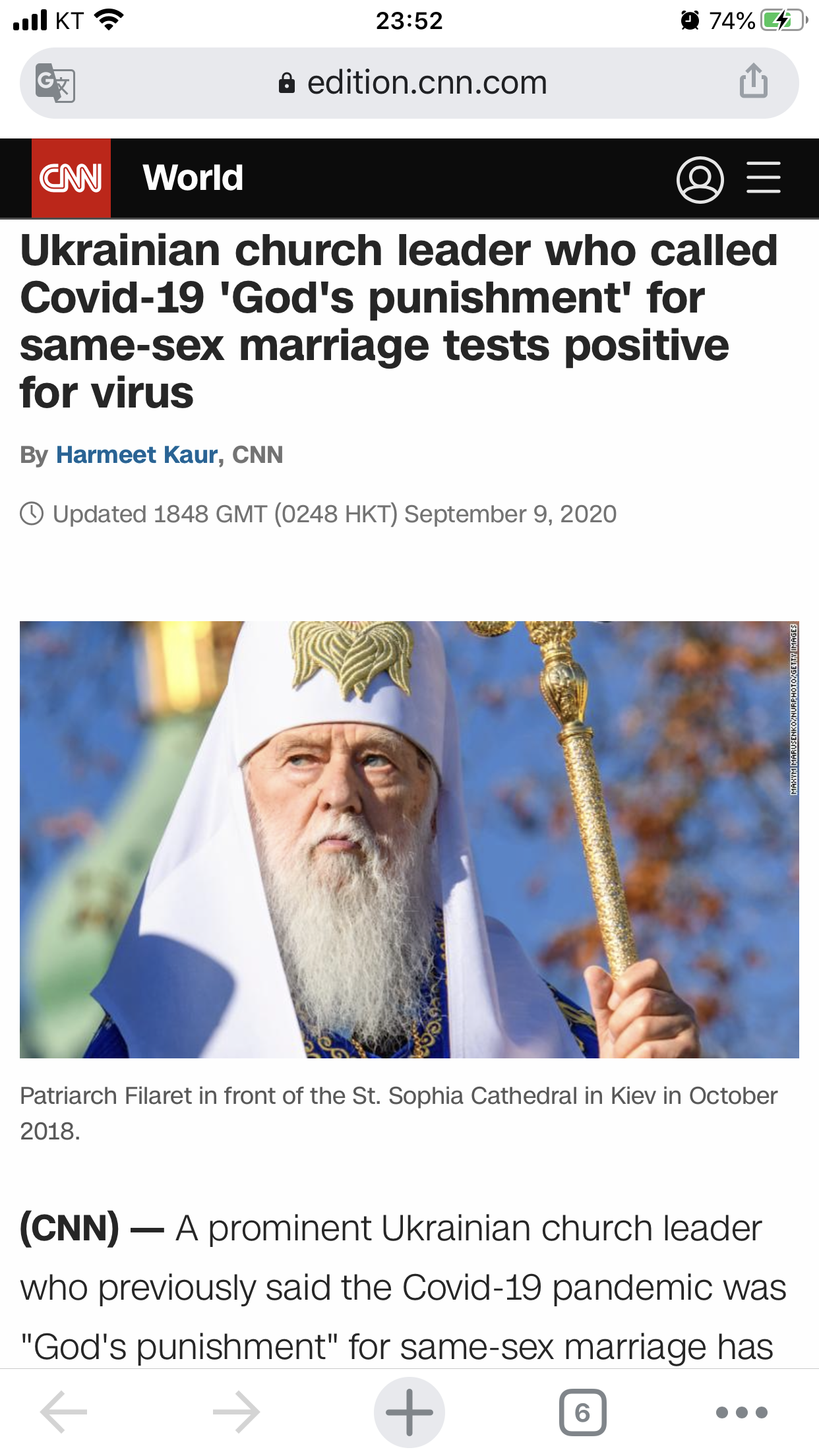 https://edition.cnn.com/2020/09/09/europe/ukrainian-leader-covid-same-sex-marriage-trnd/index.html A prominent Ukrainian church leader who previously said the Covid-19 pandemic was "God's punishment" for same-sex marriage has tested positive for the virus. 근데 지가 걸림. 0