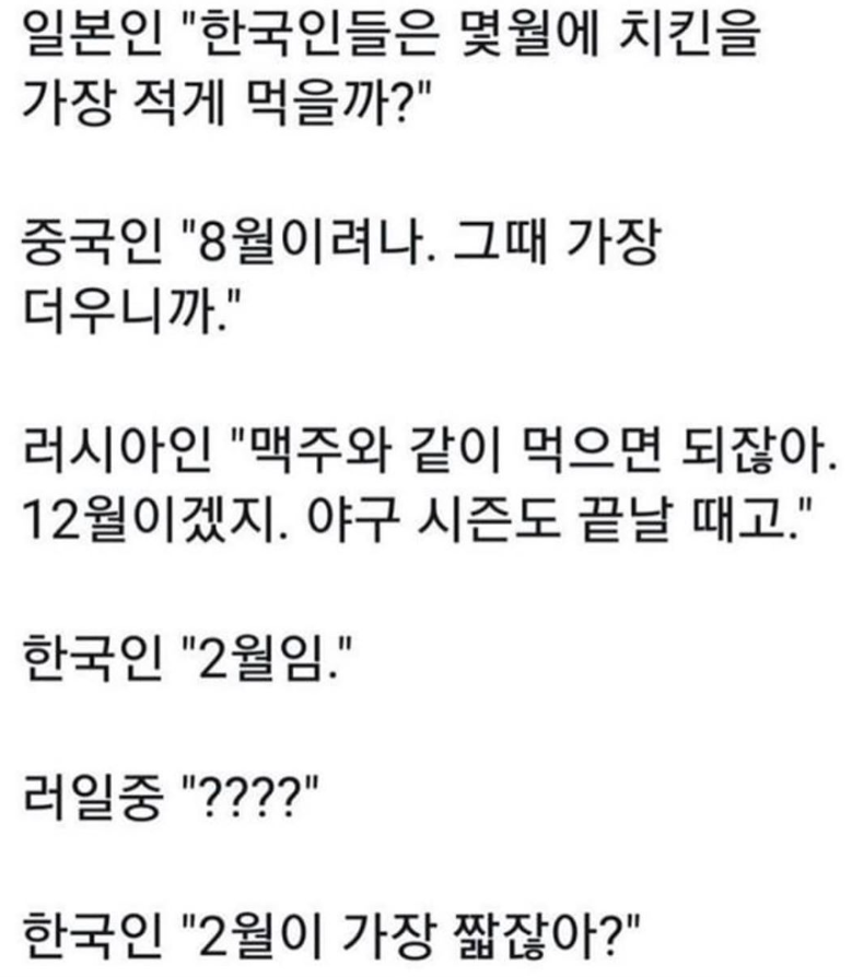 | Subject | 한국인들은 몇 월에 치킨을 가장 적게 먹을까? |
