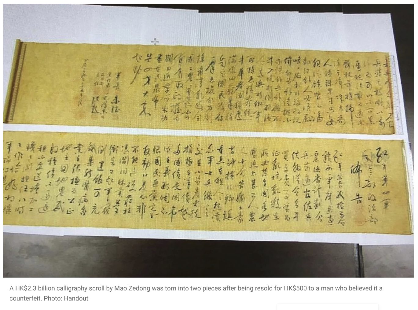 Stolen Mao Zedong calligraphy said to be worth billions torn in half by unwitting Hong Kong buyer