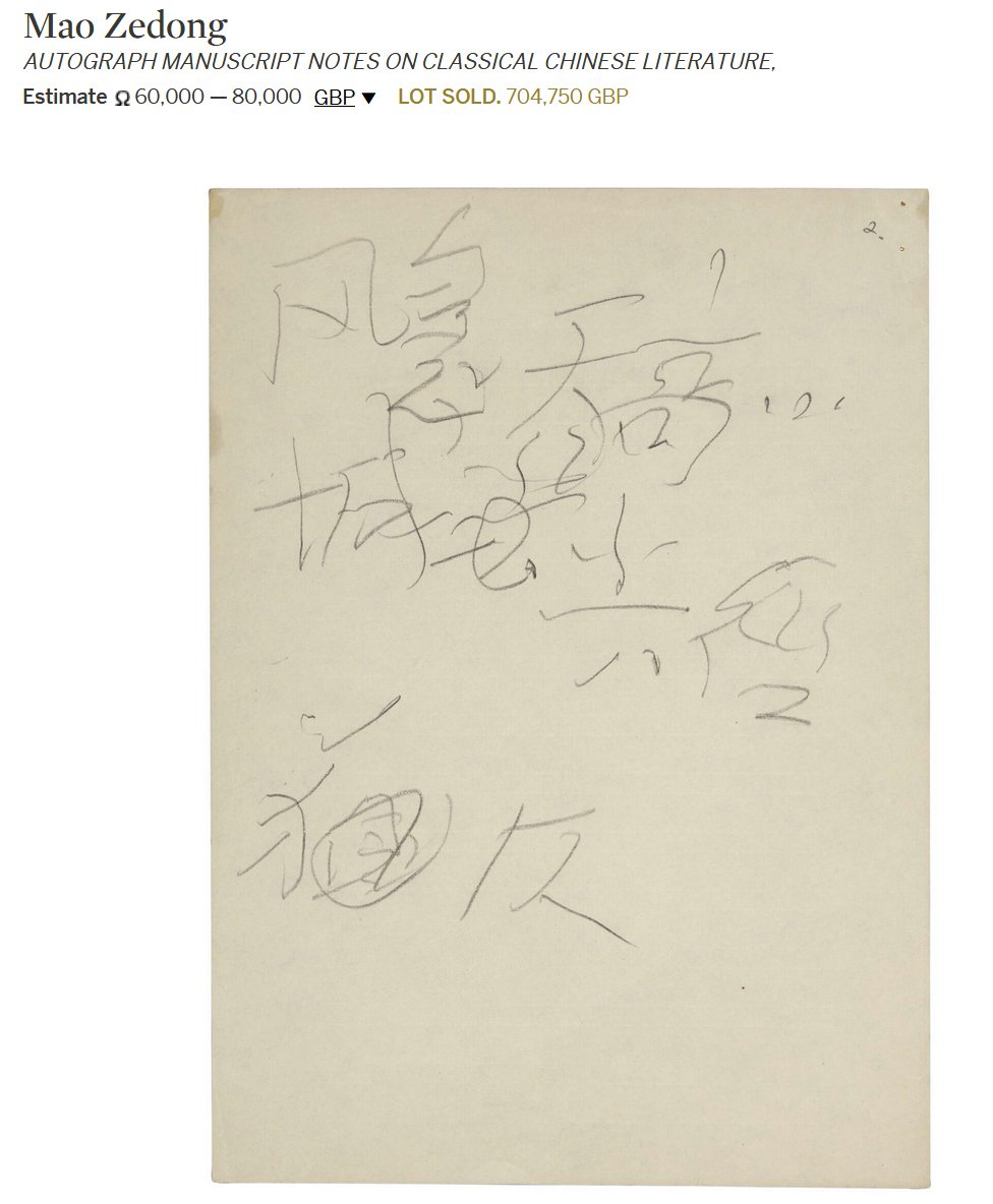 2017년 소더비 런던 경매에서 약 70만 파운드(약 10억원)에 마오쩌둥 친필 노트가 낙찰된 적이 있습니다.
