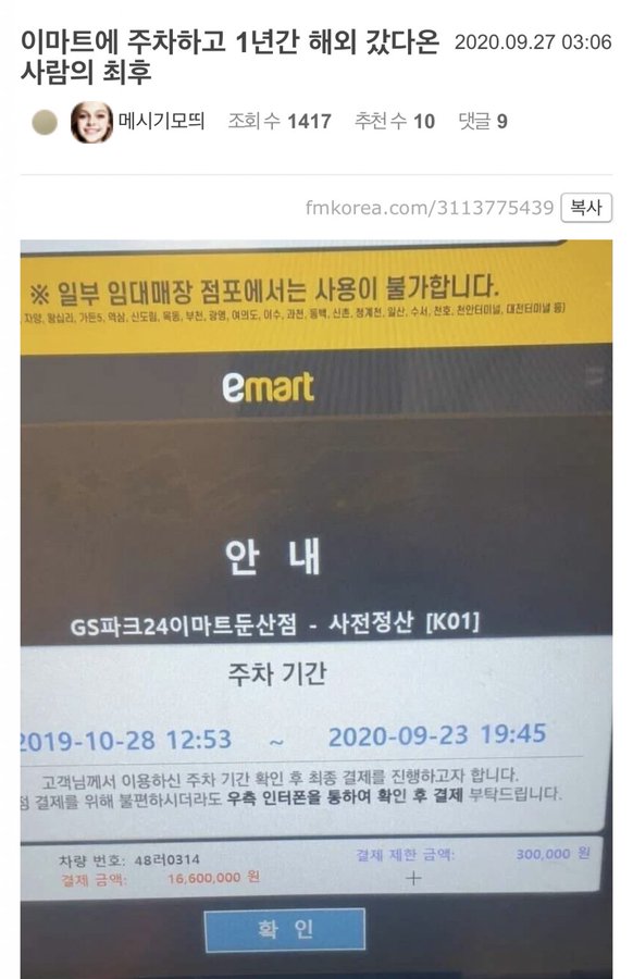 | Subject | [펌]이마트에 주차하고 1년간 해외다녀온 사람의 최후 |
