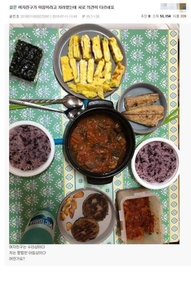 | Subject | 여친이 차려준 아침밥상 수라상이다 vs 평범하다 |
