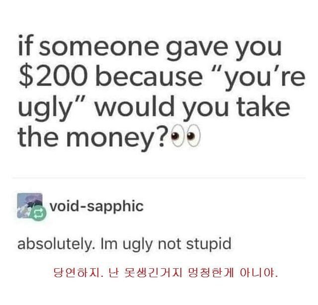 Subject   누군가 20만원을 주면서 "니가 못생겨서 주는거야"라고 한다면 돈을 받겠습니까?