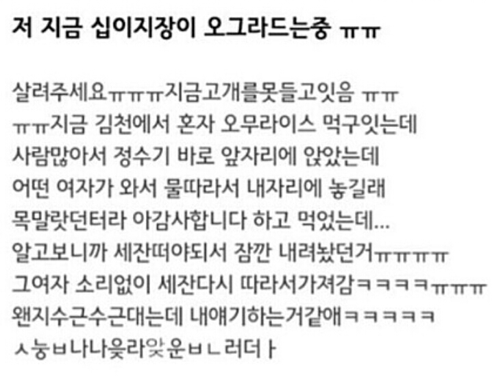| Subject | 김밥천국에서 모르는 여자분이 물 떠다줌 |