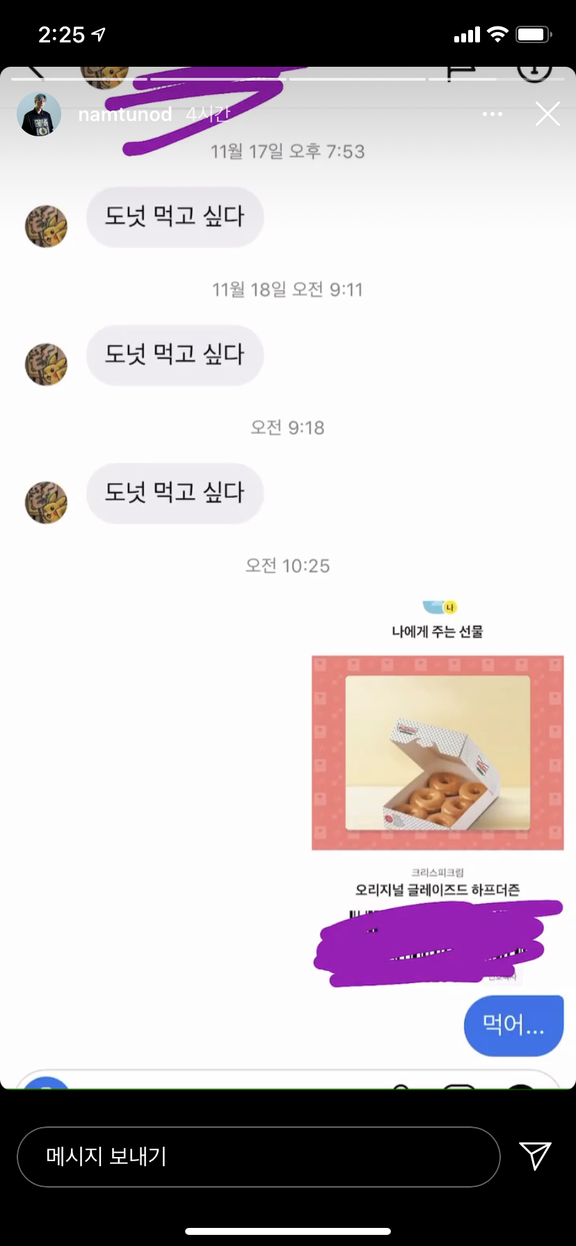 어떤 사람이 2019년부터 DM으로 꾸준히 도넛맨한테 도넛 먹고 싶다고 보냄. 그리고 진짜 도넛맨이 도넛을 선물함 ㅋㅋㅋㅋ 0