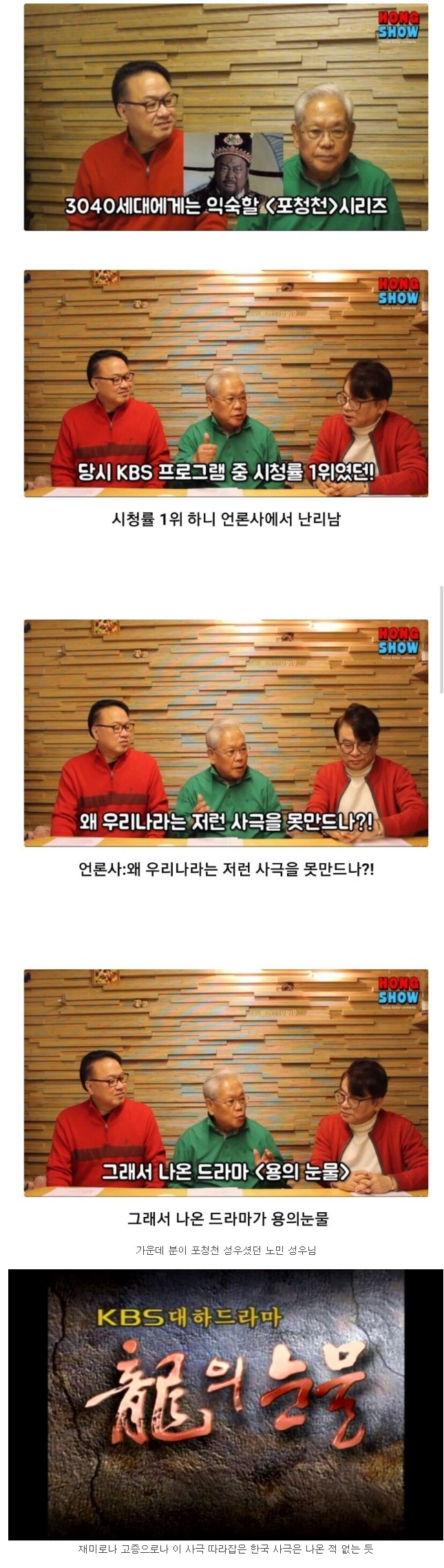https://youtu.be/c60_mj4W51M 6분 20초대부터 포청천 이야기 나오면서 ㅎ 음 찾아보니 용의눈물 전에도 찬란한 여명이라는 대하사극이 있던데하는 의문이 잠깐 들었지만. 여튼 모 유툽 PPL 논란 보니 생각나서 ㅠㅠ 요새 방송계는 PPL이 제작비 효자노릇하는데 사극은 그게 불가하죠. 한국 역사를 홍보하는거니 한국 PPL인 셈 치고 한국인에게 돈을 걷... 0