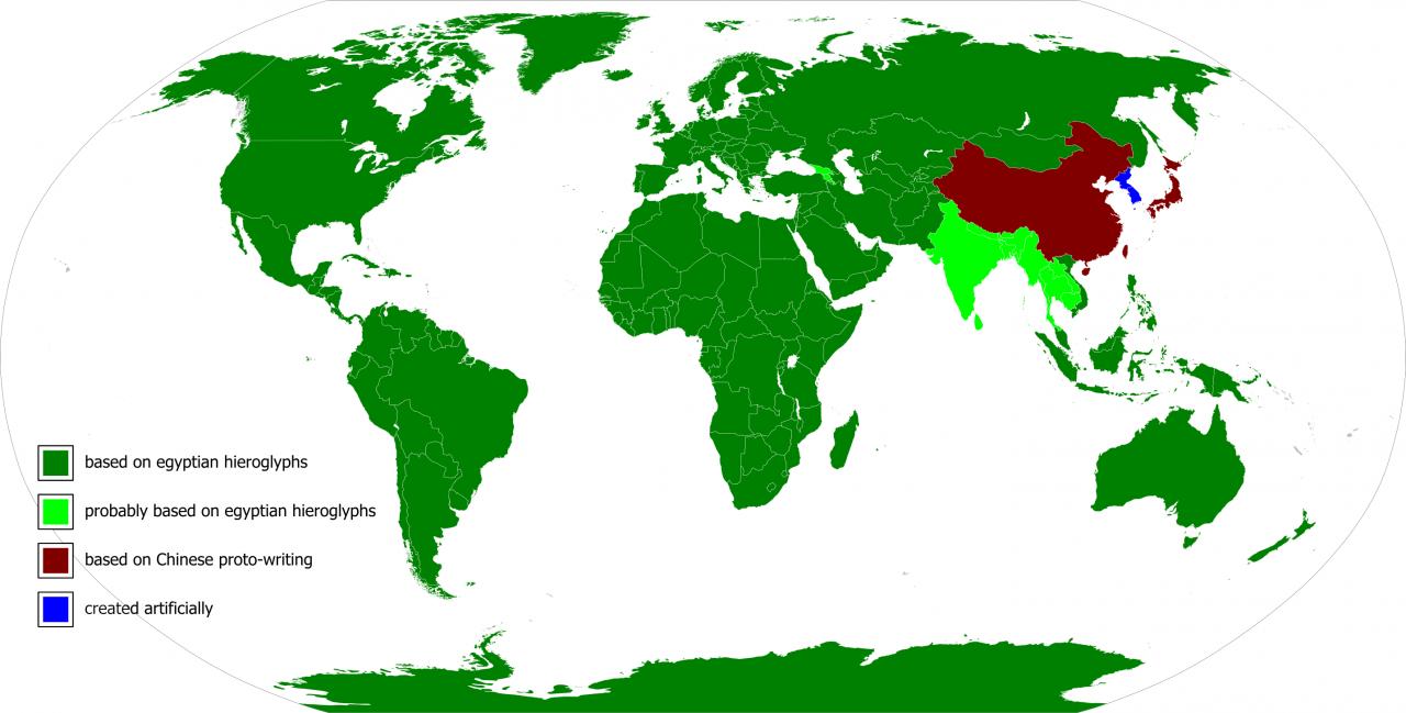 녹색 : 이집트 상형 문자 유래 연두 : 이집트 상형문자에서 유래 된 것으로 추정 고동 : 갑골 문자에서 유래 파랑 : 인위적 발명 1