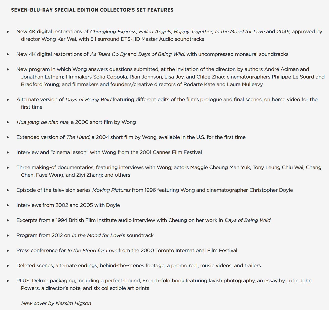https://www.criterion.com/boxsets/4117-world-of-wong-kar-wai 이건 사야 합니다?! 3월 23일 공식 출시인 것 같습니다. 우리나라에도 공식 수입한다는 얘기가 있더라구요. WORLD OF WONG KAR WAI - COMING SOON! from Janus Films on Vimeo. 4