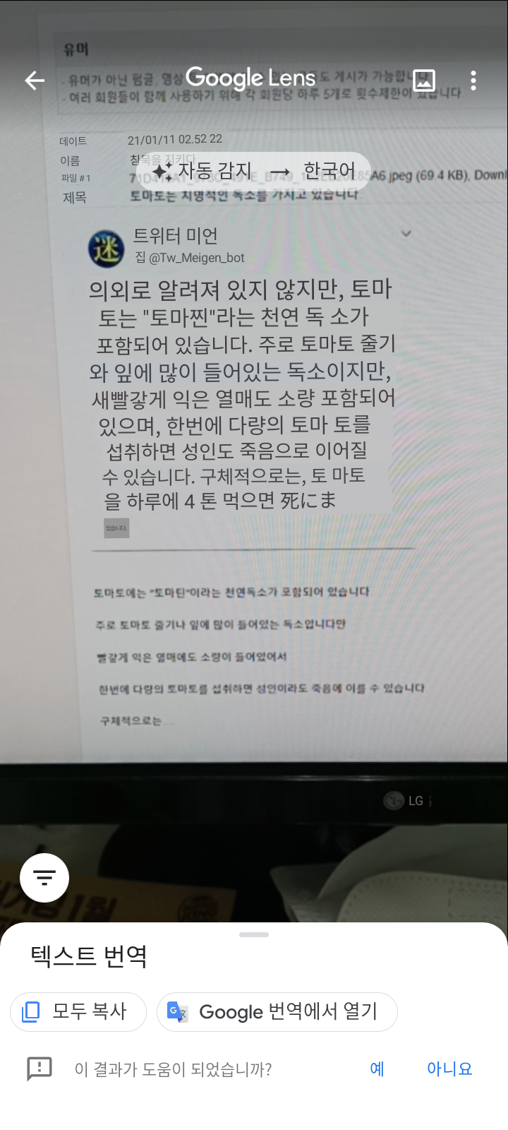 토마토를 하루에 [4톤] 먹으면 죽습니다.