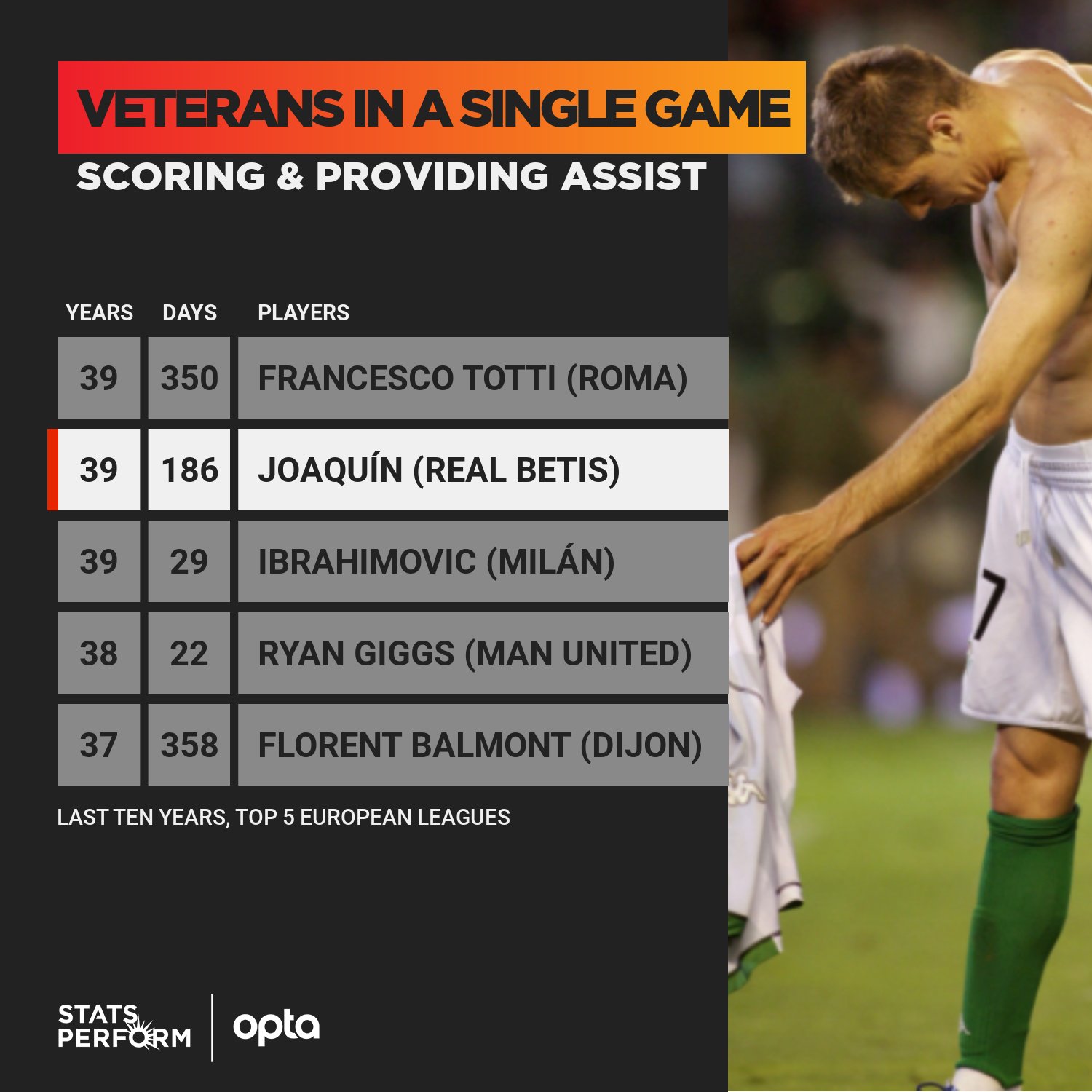 0-2로 지고 있던 경기 78분 가벼운 부상으로부터 복귀전으로서 교체 투입된 호아킨. 85분 추격골 어시스트 92분 동점골 득점 그래도 아직은 호아킨. 지난 10년간 유럽 5대 리그에서 단일경기 골과 어시스트를 모두 기록한 최고령 선수 2위에 위치했다고 하네요. 호아킨은 81년생으로 즐라탄과 동갑입니다. 1
