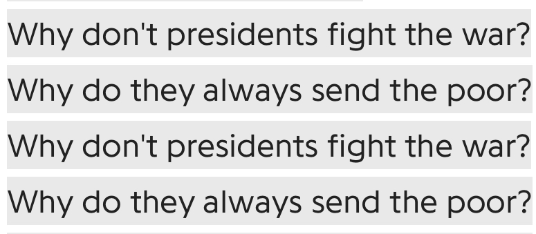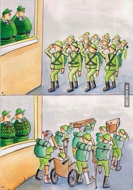 전쟁을 일으키는 건 뒷방 노인네들, 전리품은 자본가들이, 명예는 와인잔 기울이던 장군들이 챙기고 젊은이들은 상처만 남는 거.