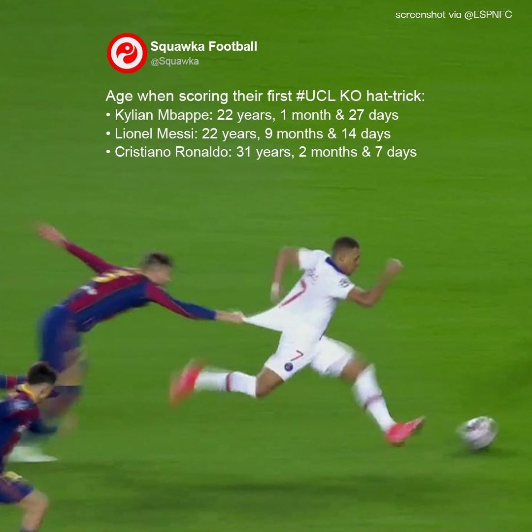 Lionel Messi 2010. 04. 06. 22 years, 9 months, 14 days (vs. Arsenal) Cristiano Ronaldo 2016. 04. 12. 31 years, 2 months, 7 days (vs. Wolfsburg) Kylian Mbappe 2021. 02. 16. 22 years, 1 months, 27 days (vs. Barcelona) 의외로 호날두가 엄청 늦군요. 녹아웃 스테이지에서 골도 많이 넣었으면서... 0