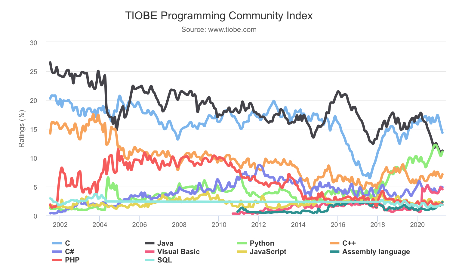 굉장히 개인적인 의견이라고 밝히고 있습니다만, 익숙하던 이름들은 피해야 될 언어로 꼽히고 있고, 들어보지 못한 언어들도 보이는 것을 보니, 세월이 느껴집니다. :) 요즘은 파이썬을 입문용으로 가르치는 대학들이 많다던데, 위에도 파이썬이 많이 보이는 것 같군요. https://www.tiobe.com/tiobe-index/ 1