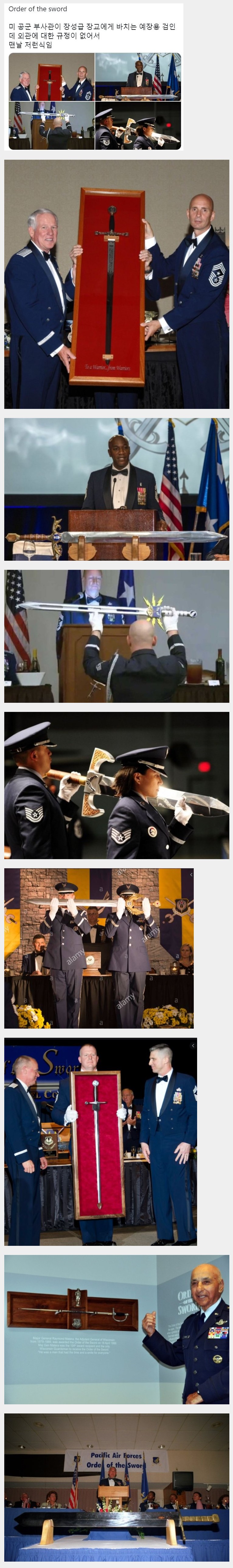 미공군은 미육군 및 미해군과 다르게 역사적 전통이 매우 짧아서 예장용 검에 대한 디자인(미해군 : 커틀리스 등)이 없기 때문에 저렇게 막 준다고 하는거래요 ㅎㅎㅎㅎ 0