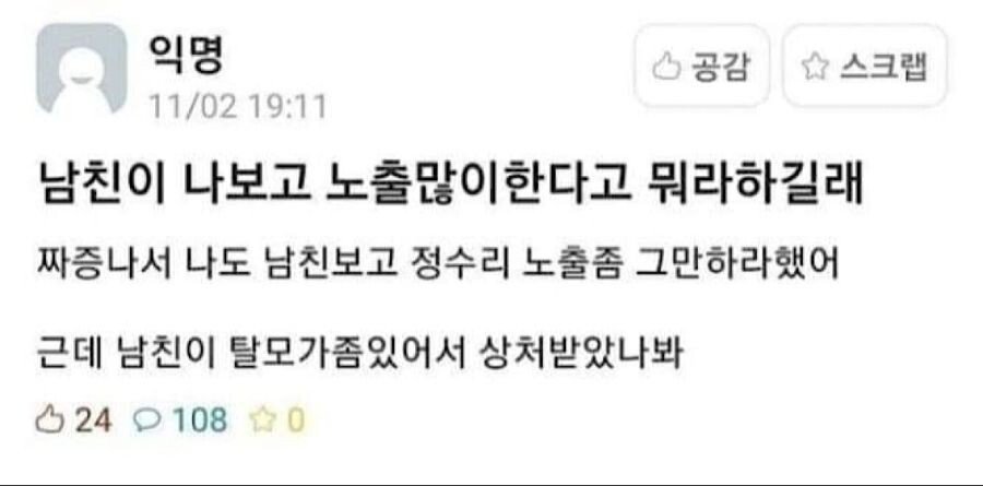 | Subject | 남친이 나보고 노출 많이 한다고 뭐라 하길래.. |