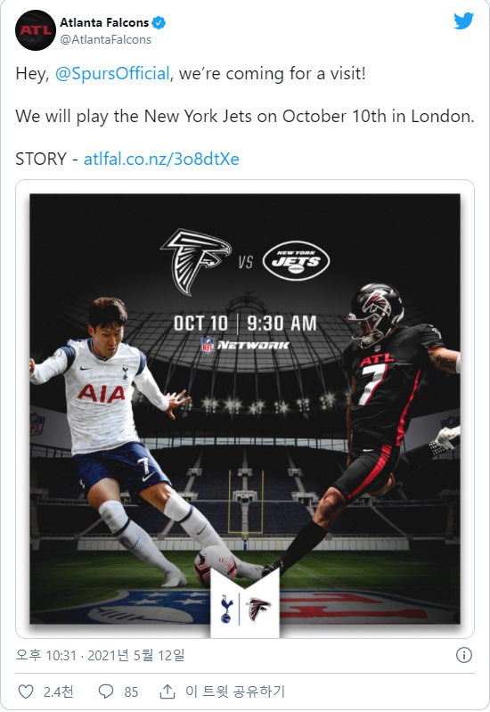 은 훼이크고 10/10 팔콘스 vs 제츠 경기가 토트넘 경기장에서 열린다는 내용입니다.