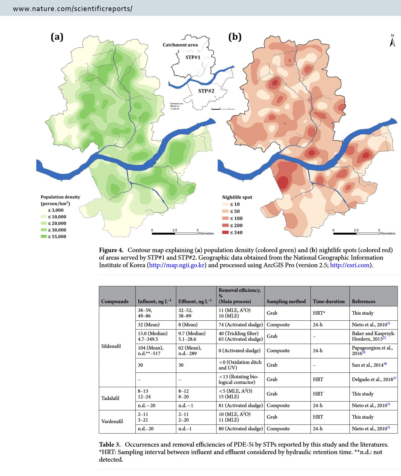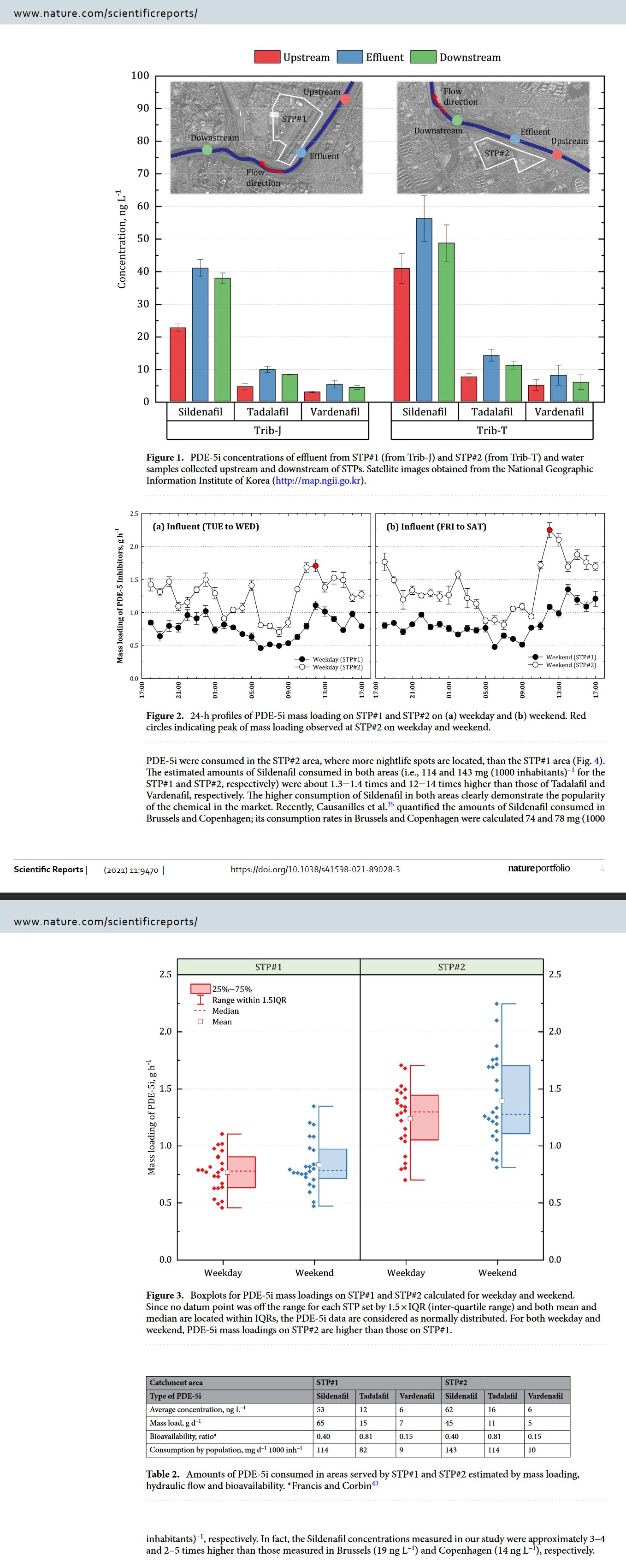 Hong, Y., Lee, I., Tae, B. et al. Contribution of sewage to occurrence of phosphodiesterase-5 inhibitors in natural water. Sci Rep 11, 9470 (2021). https://doi.org/10.1038/s41598-021-89028-3 https://rdcu.be/ckNPf 비아그라 같은 약의 주요 성분인 PDE-5i 성분이 강남, 금요일~토요일 하수에 상대적으로 증가. 처방이 필요한 전문의약품이지만, 처방받는 것이 어려운 것도 아니고, 실제로 강남 유흥업소 등에서 서비스(?)로 손님들에게 주는 경우들이 있는 것으로 알고 있읍니다. 1