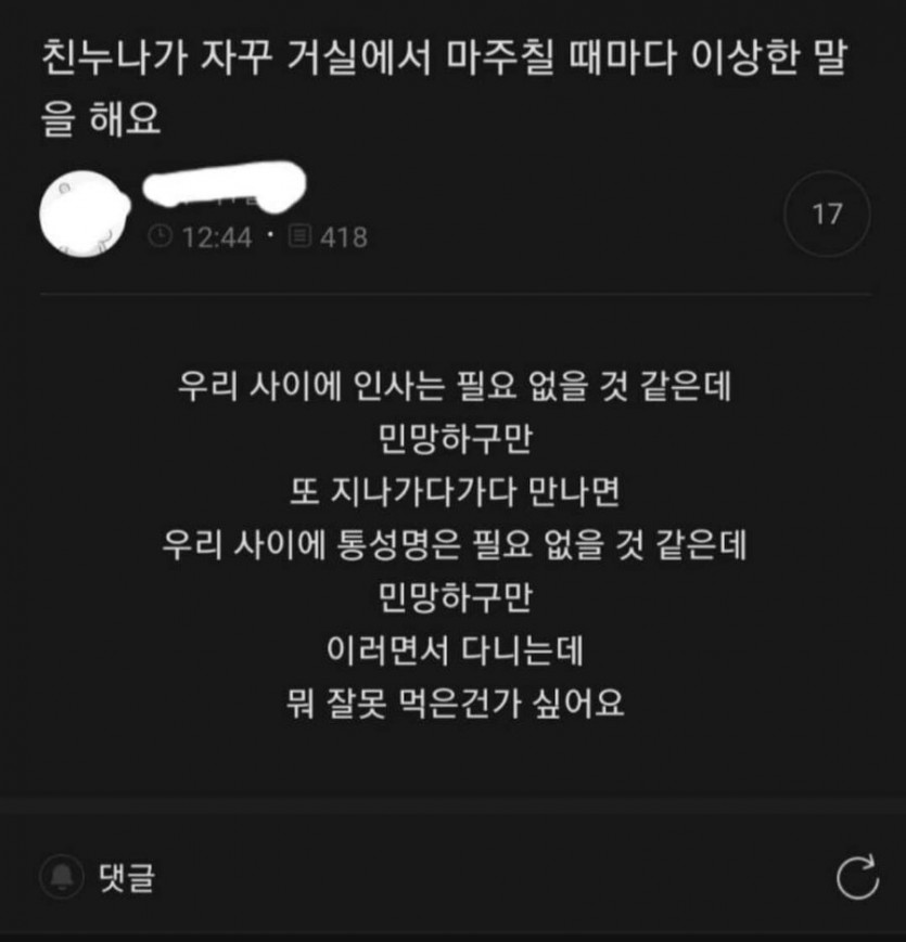 친누나가 자꾸 거실에서 마주칠 때마다 이상한 말을 해요