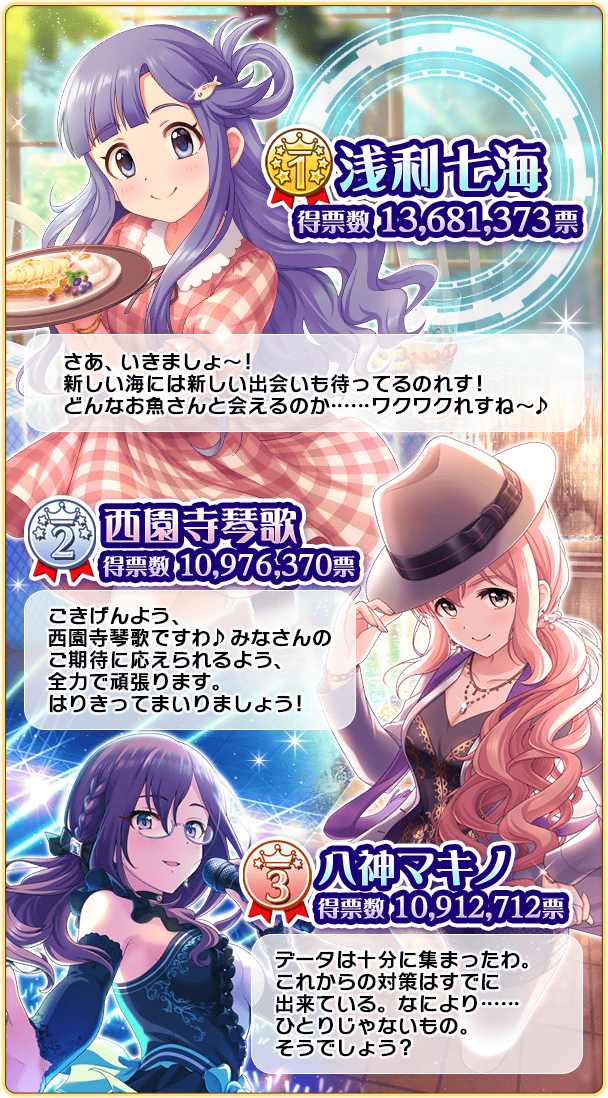 저번부터는 음원 발매 대상이 신데렐라 걸 전체 Top 5와 보이스 투표 Top 3로 바뀌었습니다. (특히 보이스 투표는 신캐가 없이 다 기존캐라 진검승부였을듯...) 0