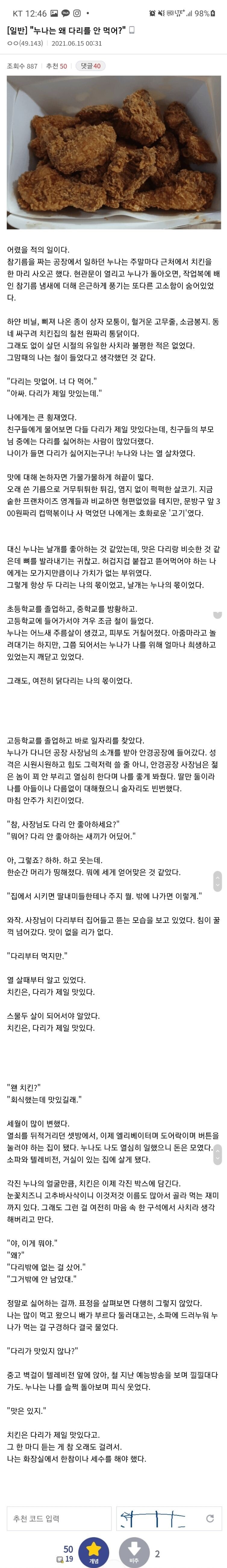 | Subject | "누나는 왜 다리를 안 먹어?" |