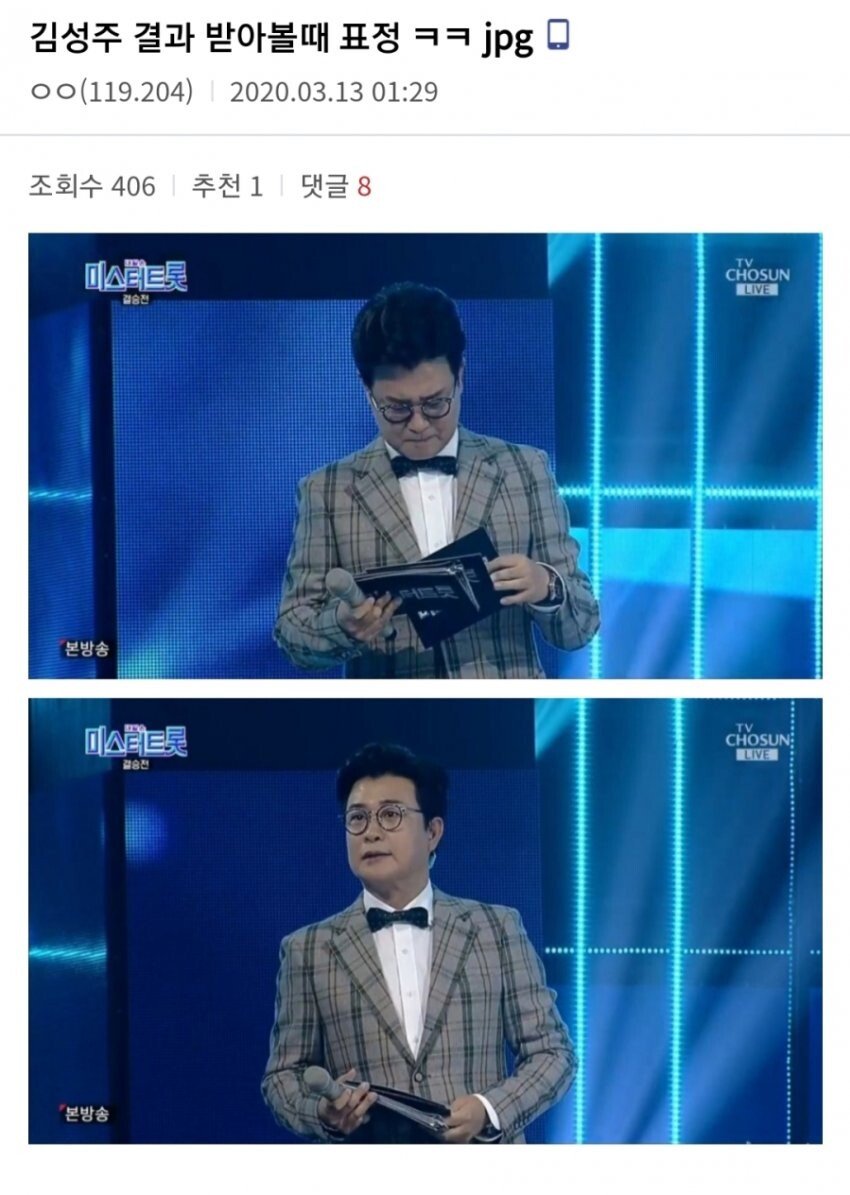 문자투표가 폭주해 집계가 딜레이 되자 제작진이 달랑 세줄 적힌 큐시트를 전달하자 김성주가 무쌍을 찍었다함.