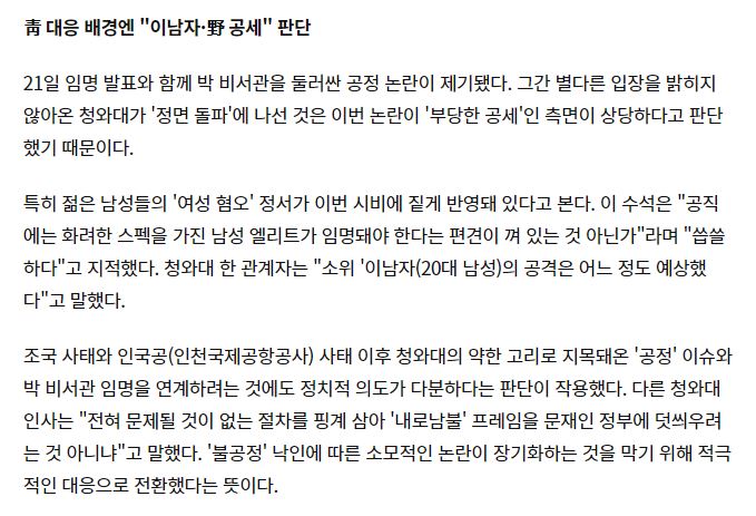 “20대 1급 공무원”이라는게 어그로를 끌고 있지만, 이게 정말 중요한 걸까요? 임명직은 인사권자 판단 하에 누구라도 임명할 수 있는 자리입니다. 이를 비판하기 위해 비서관의 나이를 가져오는 건 좀 저열하네요.