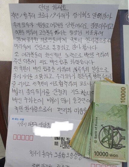 한 어르신이 백신 사는데 돕고 싶다고 30만원이랑 편지를 보냈다고 하네요. 질병청은 감사한 마음만 받고 돈은 어르신께 정중히 돌려 드렸다고 합니다. 참 멋진 어르신이네요.. 1