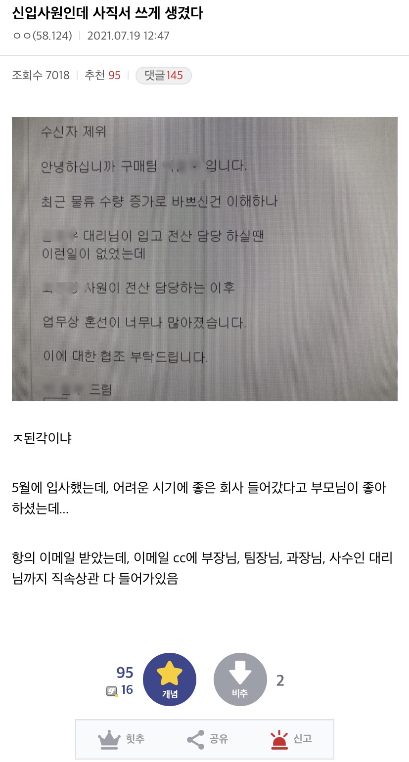 아니 무슨 실수를 어떻게 했길래… 이제 2달 된 신입에게 너무 가혹한데.. 0