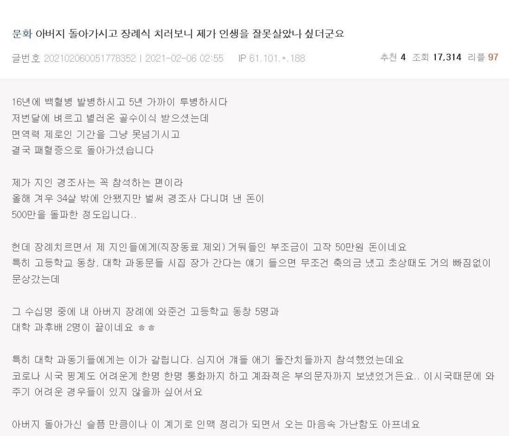 | Subject | 아버지 장례식을 치르고 인생 현타가 온 사람 |